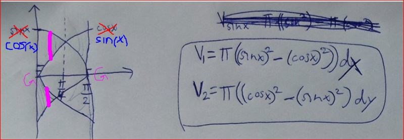 Det känns faktiskt som jag nu börjar förstå vad du menar. Jag ska alltså ta följande som på bilden? Eftersom att radien för delen motsvarar i ena faklet sinx-cosx och i andra fallet cosx-sinx och sedan sätta in det i volymen för en del. vid volymen är det för en bit och inte hela.