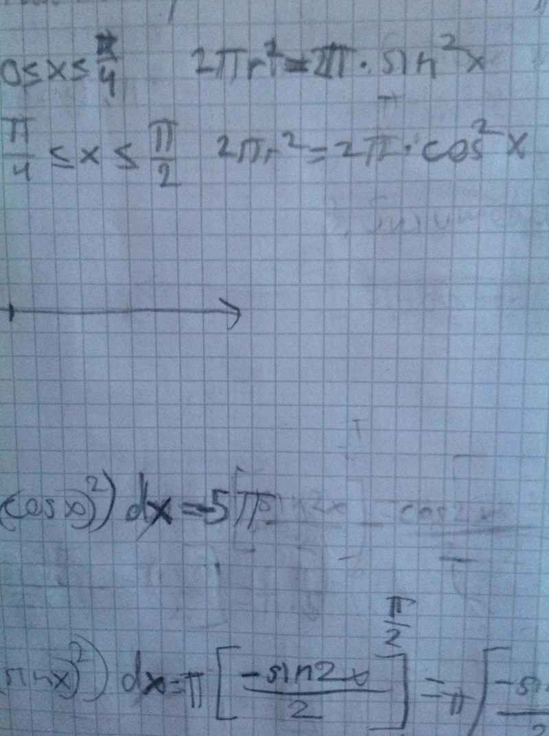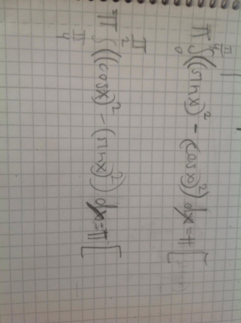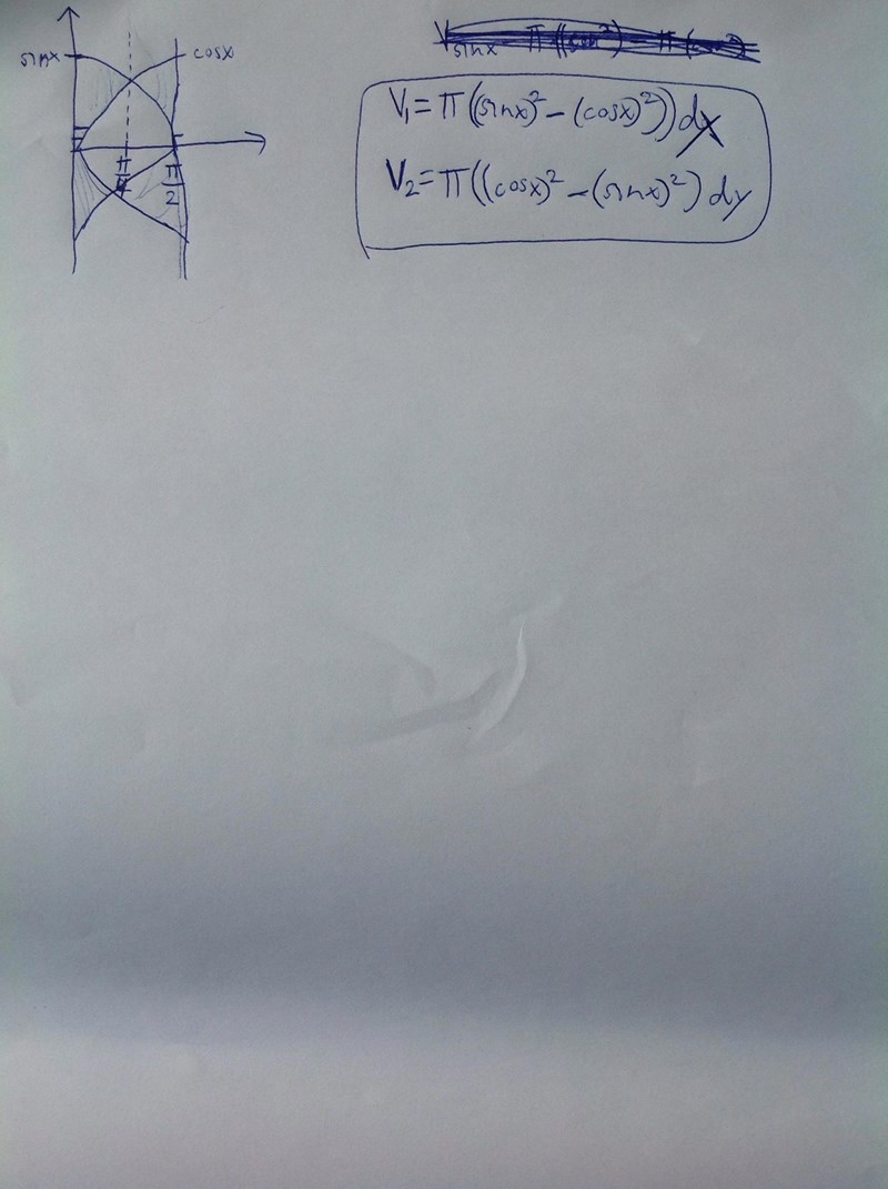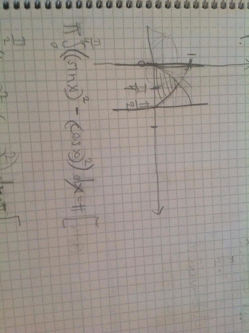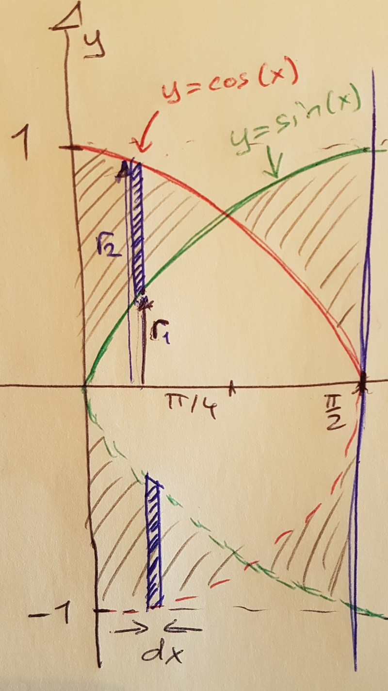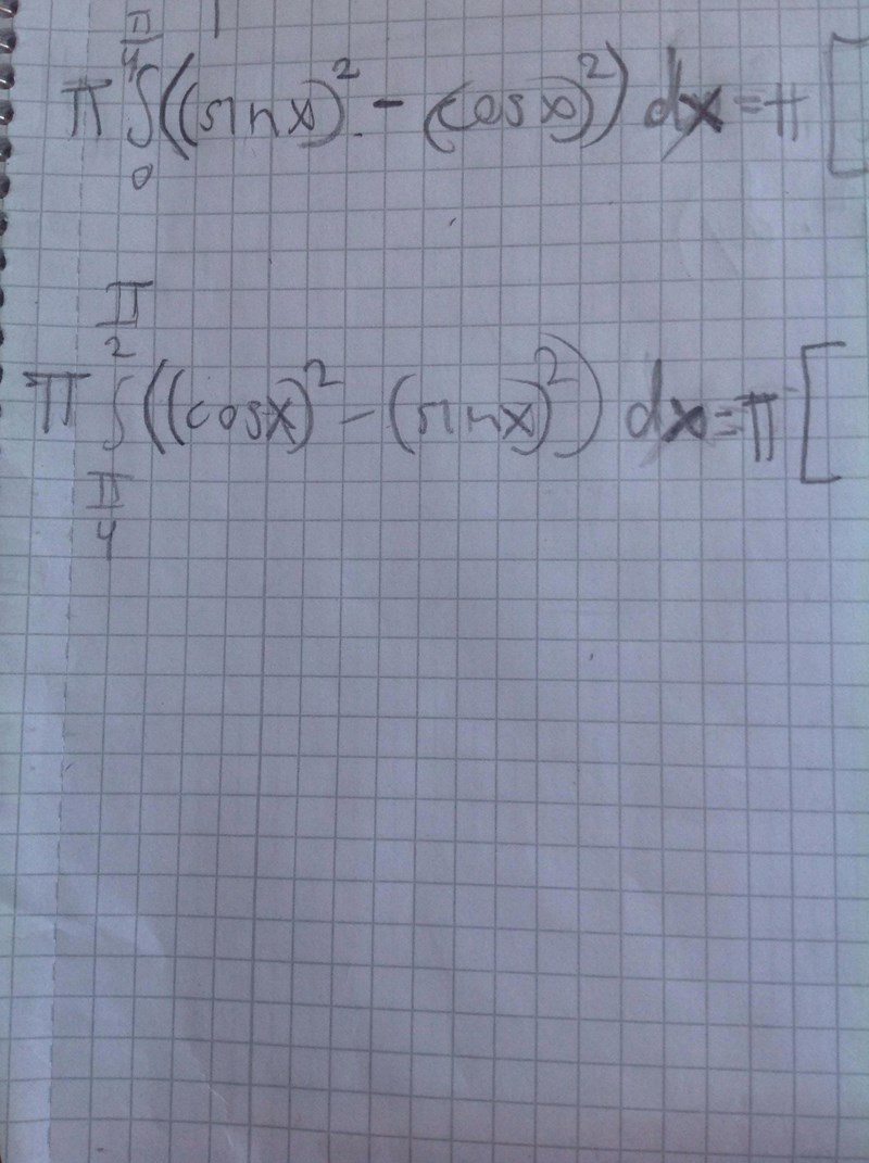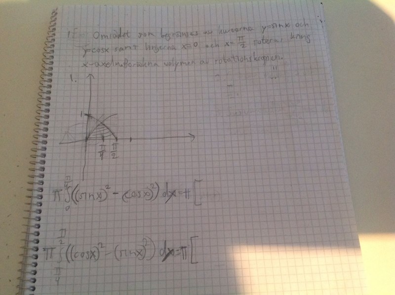 juste, tvärtom ska det ju vara. Varför jag ritade in de horisontellt vet jag inte men förstår hur det blir som det är nu. Det blir alltså Vsegment1= pi(cos^2x-sin^2x)dx och Vsegment2=pi(sin^2x-cos^2x)dx?
