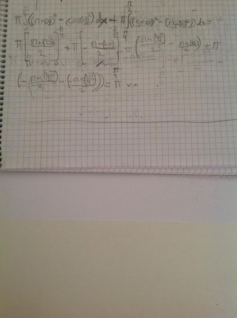 Den här metoden bör väll fungera eftersom jag då tar pi*sinx^2dx som är volymen för ena "vingeln" sedan subtraherar jag pi*cosx^2dx och tvärtom på andra då tar jag pi*cosx^2dx och subtraherar pi*sinx^2dx?