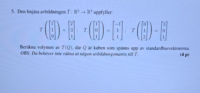 Frågan är varför man ska ens dela men AI säger i alla fall såhär: den ursprungliga volym är ju argumentet av vektorerna  som T har men jag trodde detta var standardbasvektorerna e1,e2 och e3 men vi vet ej bilden (Te1) osv och jag trodde T(e1)=e1 men det står inte angivet...