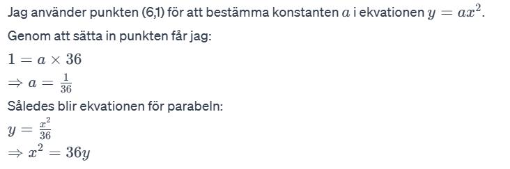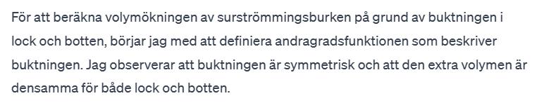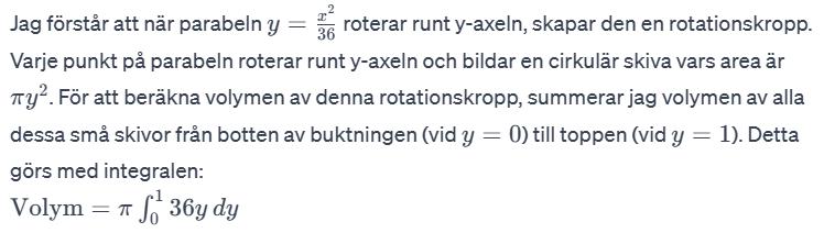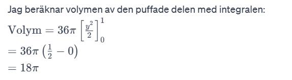 Du behöver motivera varför du kan beräkna volymen av den "puffade" delen med hjälp av just den integralen bättre. Du har tagit fram parablens funktion, och du har löst integralen, men det fattas ett steg däremellan.