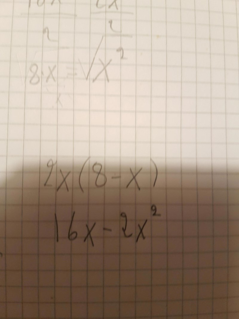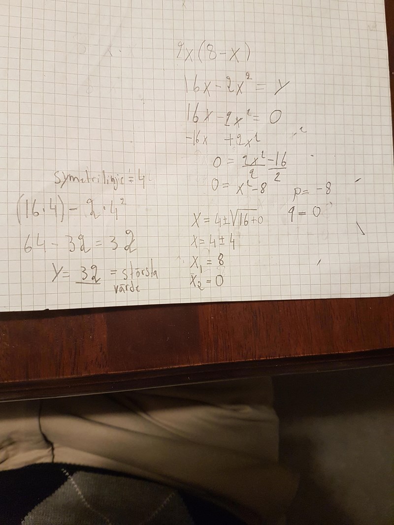 Mrblue skrev :Asså den har största värde eftersom x^2 värdet är negativt. Och då måste jag lösa ekvationen 0=16x-2x^2?