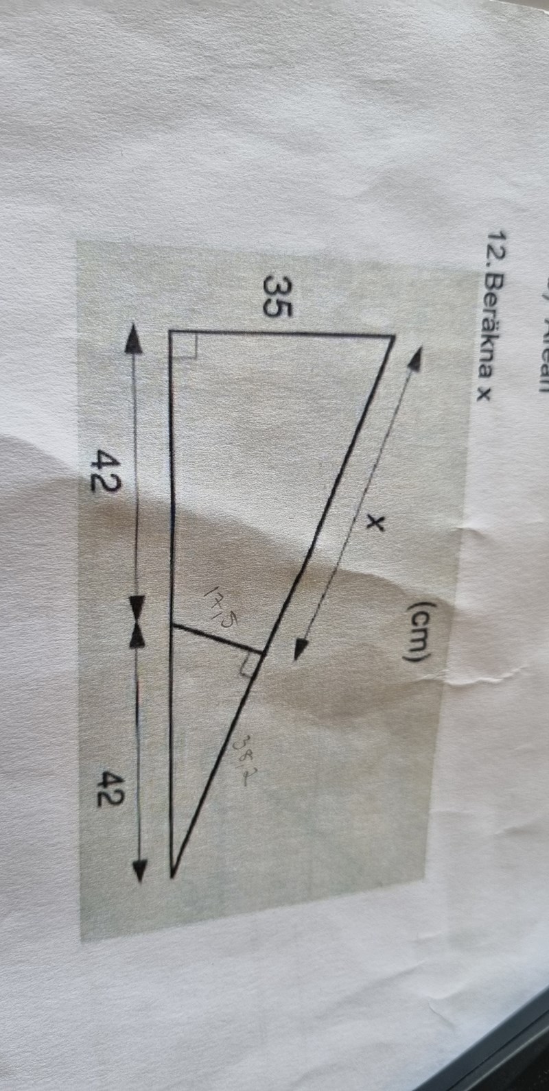 Det stämmer inte. x / 35 motsvarar katet / katet, men 42 / 42 + 42 motsvarar hypotenusa / katet.