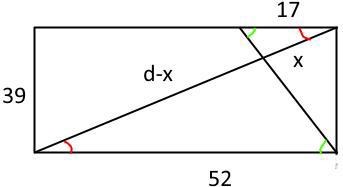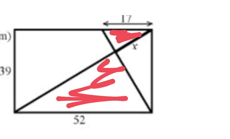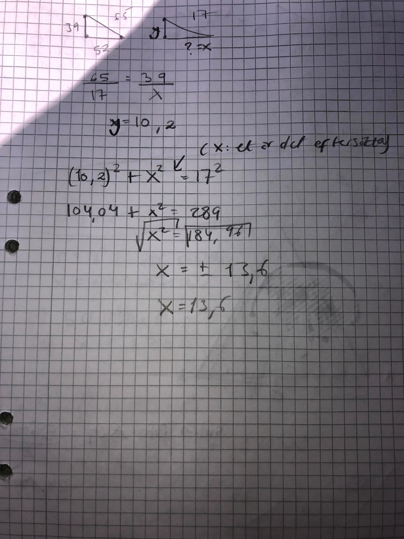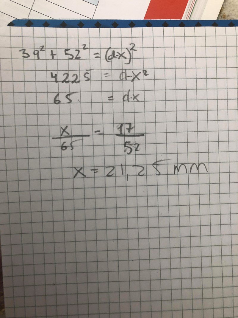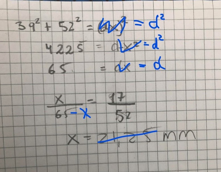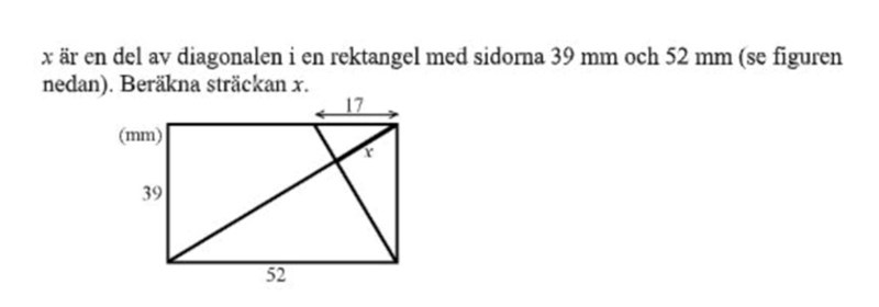 Hej! Jag kom fram till att x är = 13,6. Jag använde mig av likformighet. Ena triangeln är den som har höjden 39 mm , basen 52 mm och hypotenusan 65 mm. Andra triangelns hypotenusa är 17 mm och en av kateterna för x.