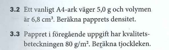 haraldfreij skrev:Har du löst 3.2? Då vet du hur mycket varje m³ papper väger. Och så vet du hur mycket varje m² väger enligt den nya uppgiften. Då kan du räkna ut hur många m² papper man måste stapla för att få en m³, alltså hur många papper som krävs för att få ihop till en meter på höjden.
