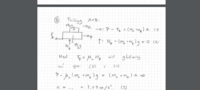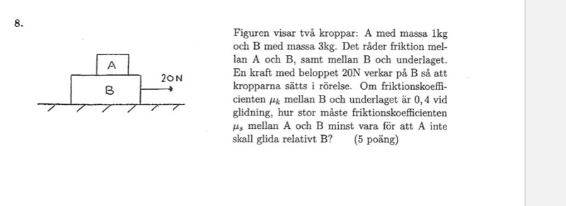 I facit löser de uppgiften utifrån att accelerationen är densamma för låda A och B, vilket jag inte förstår. Antar man detta när ingen information ges i uppgiften, eller är det en grundläggande princip man bör känna till? Eller bli det så på grund av att man ska hitta koffiecentien där A inte glider, alltså där A och B är sammanbundna ?