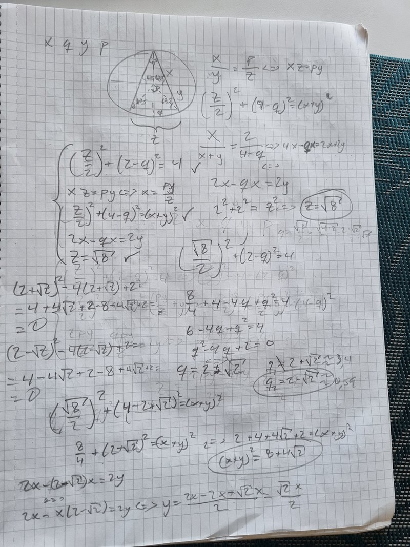"En likbent triangel är inskriven i en cirkel med radie 2 dm så att vinkeln mellan de lika sidorna är 45 grader. Beräkna triangelns area".