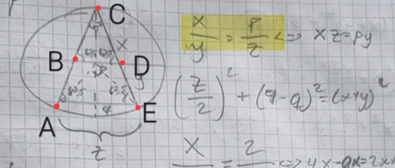 Det stämmer att trianglarna ACE och BCD är likformiga, men sambandet ska i så fall vara