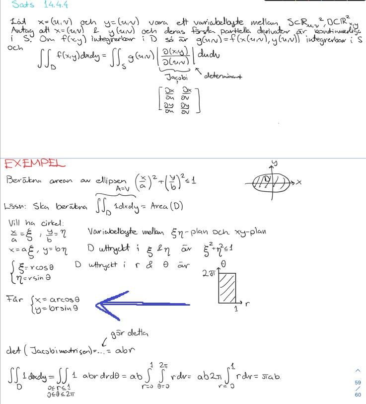 Tomten skrev:a och b var ju givna i texten (ellipsens stor- och lillaxel) och måste därför ingå i substitutionen om vi vill forma om D till en cirkelskiva.