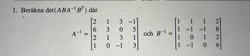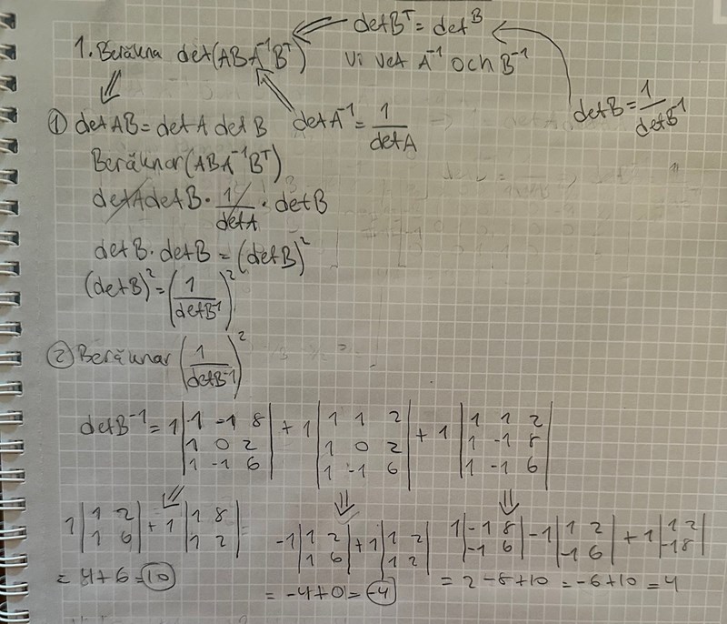 Har suttit och försökt ett tag men hittar inte felet.. Vad gör jag för fel när jag beräknar determinananten? Svaret ska bli 1/4 och det blir det inte med min detB-1 = 10