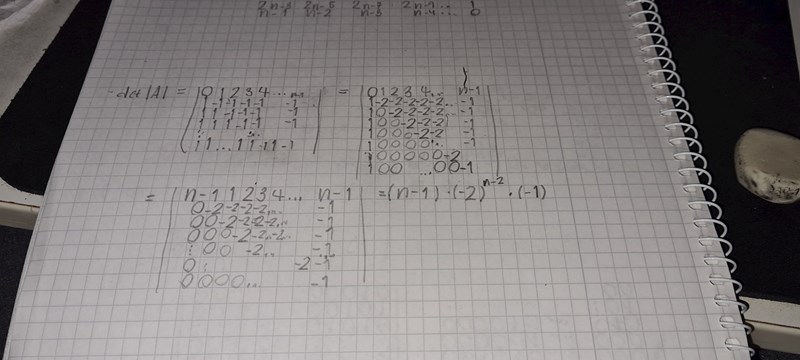Jag förstår inte anledningen bakom potensen på -1? Tecknet blir väl redan rätt med bara -2^(n-2)*(-1)? Om n=udda -> antalet rader med negativt tecken på diagonalen= jämnt ->stämmer med -2^(n-2)×(-1) & tvärtom. Vad missar jag?