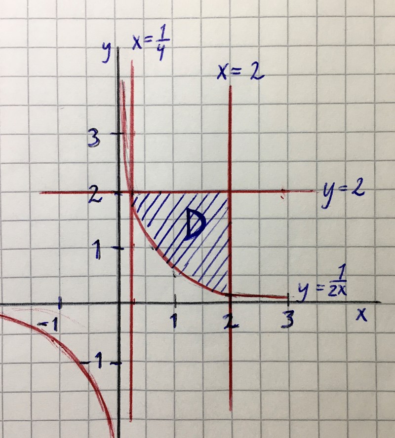 Nej. Varför har du inte ritat - då skulle du ha sett hur området ser ut. Det står i uppgiften att så i k-riktningen begränsas området av två lodräta linjer x=0,25 respektive x=2 och att , alltså en rät linje men också en kurva som är en omvänd proportionalitet.