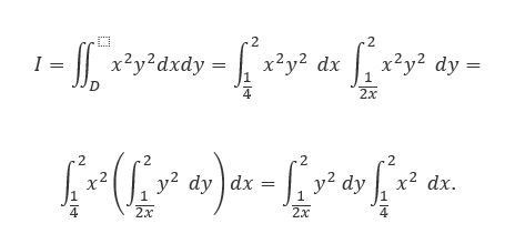 I det här fallet är integranden en produkt av en funktion som bara beror på x och en funktion som bara beror på y: . Det visar sig då att dubbelintegralen själv faktoriserar sig som en produkt av två enkelintegraler.