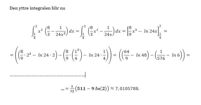 Och så undrar jag förstås om det allra sista jag ska göra för att beräkna dubbelintegralen i uppgiften är att integrera värdet för den yttre integralen, alltså se den som en integrand som ska integreras på nytt?