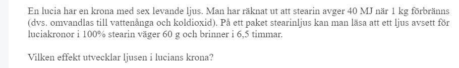 Ture skrev:Ja, Vi har räknat ut effekten från ett ljus, luciakronan innehåller 6 ljus,