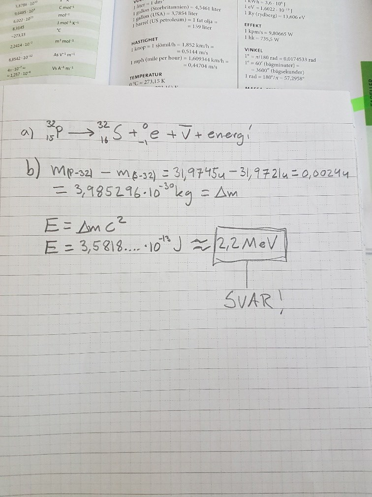 Jag har löst a) genom att googla vilken sorts Beta-sönderfall P-32 avger, kan man avgöra detta på något annat sätt ? (P-32 finns inte med i boken "formler och tabeller")