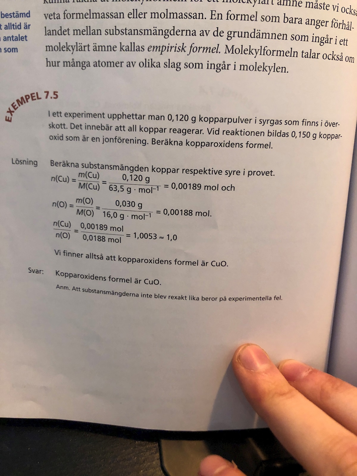 i exempel 7.5 Så förstår jag inte hur man kan beräkna formeln innan man vet antalet molekyler av koppar och syre? Molmassan är ju ex 16 för en syreatom O men 32 för O2