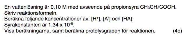 Börja med att göra en tabell över koncentrationerna i en tänkt oprotolyserad lösning, förändringen (låt förändringen vara -x för propionsyran och +x för oxoniumjonerna och propionatjonerna) och i jämviktslösningen. Sätt in värdena i uttrycket för jämviktskonstanten och beräkna x.