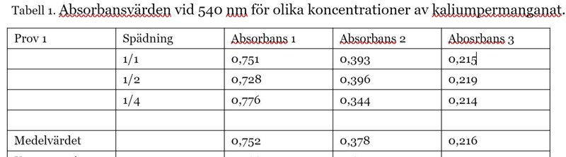 Vid spädning av KMnO4 fick jag de här mätvärdena som ni kan se i bilden