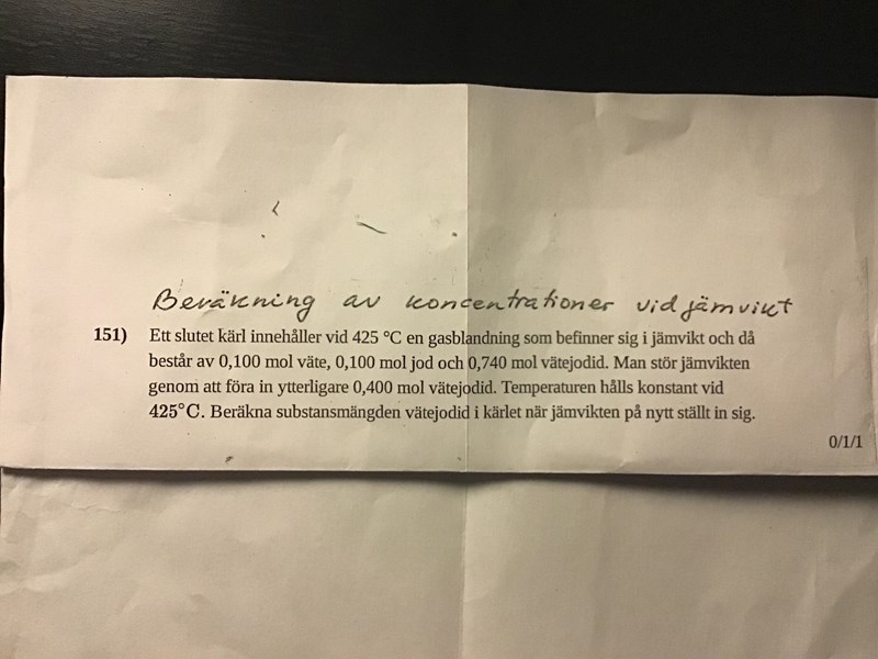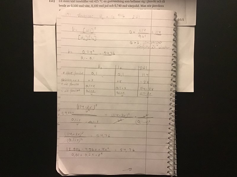 Du borde inse att ditt svar är orimligt - om du har totalt 1,34 mol gas i behållaren så kan det inte bli 90 mol av det - eller också skulle du bli rik på att sälja vätejodid!