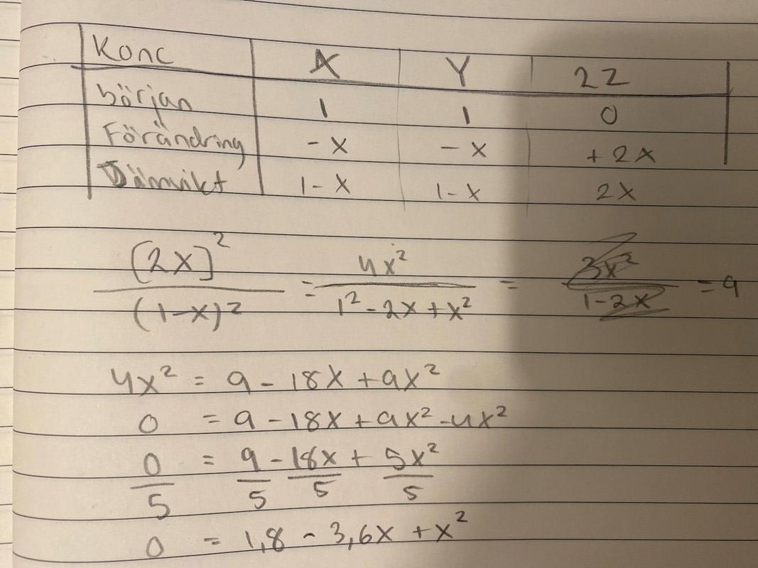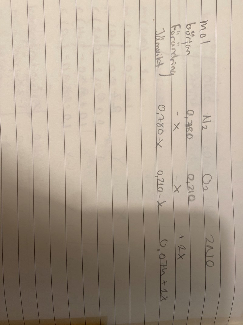 | Jämvikt | 0,780-x | 0,210-x | 2x |