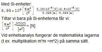 I ditt fall så har du 0.15 microCoulomb och 2.4microcoulomb. och 2.5cm. och K har enheten Nm^2/C^2. Du har alltså mixat alla möjliga prefixer och enheter. Håll dig till SI-enhter funkar bäst om man är osäker. Dvs gör om alla enheter till respektive SI notation. Längder är meter, laddningen Coulomb (C) osv.
