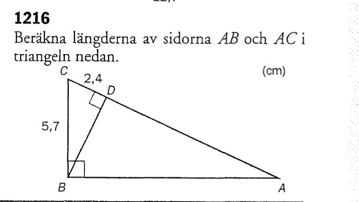 Har fastnat på ovanstående uppgift där jag fått fram sidan BD genom Pythagoras sats av den lilla triangeln (BCD) till ungefär 5,2 cm. Men här efter tar de sedan stopp när jag försöker beräkna fram längderna AB och AC med hjälp av den information jag har.