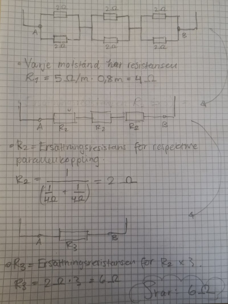 Jag har kommit fram till rätt svar men undrar nu om mitt resonemang är korrekt eller ej. Kan man rita om kopplingsschemat i uppgiften till den jag gjort (förutsatt att det endast är motstånden i mitt kopplingsschema som har resistans)?
