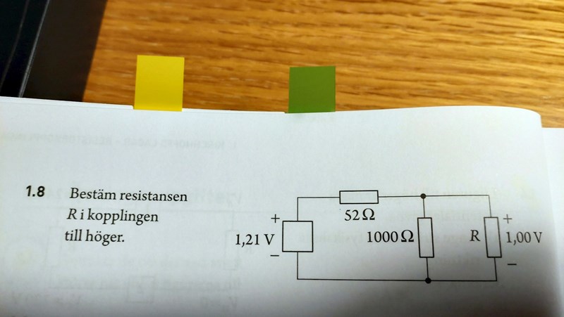 Jag räknade ut strömmen som kommer in till de parallellkopplade resistorerna (23 mA), men sedan delar ju sig strömmen så jag kan inte bara räkna ut resistansen genom att dela 1 V med 23 mA, för då får jag 43,47 Ohm vilket inte stämmer eftersom det står på facit att resultatet ska vara 329 Ohm.