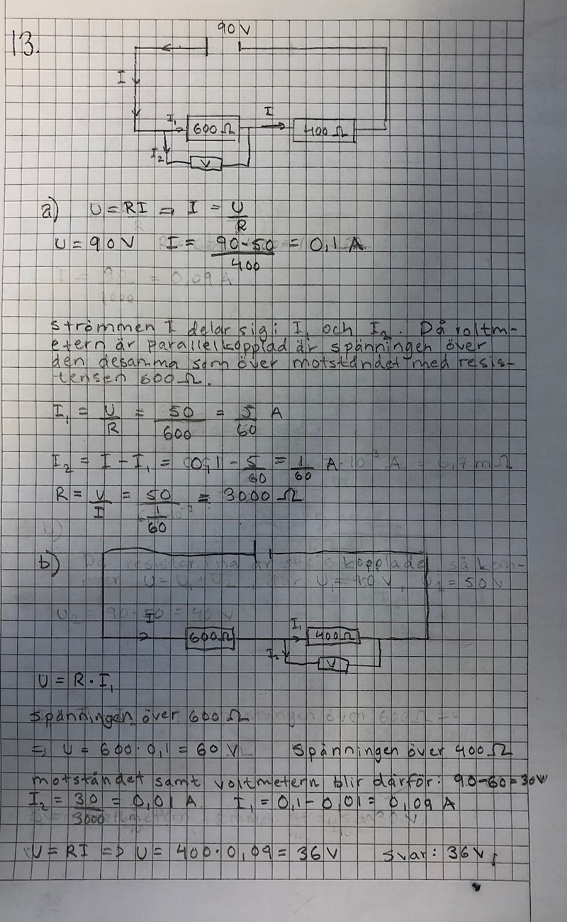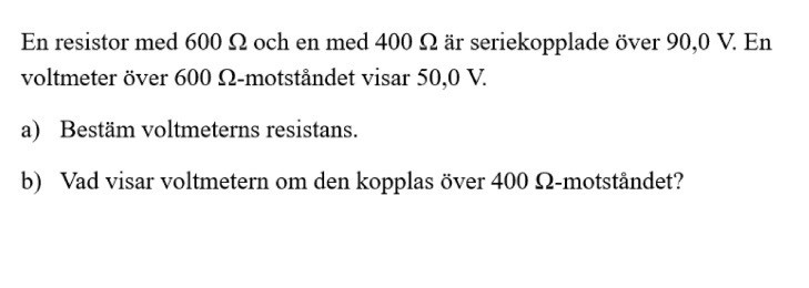 Tips: beräkna ersättningsresistansen för 400 ohm och voltmetern först.
