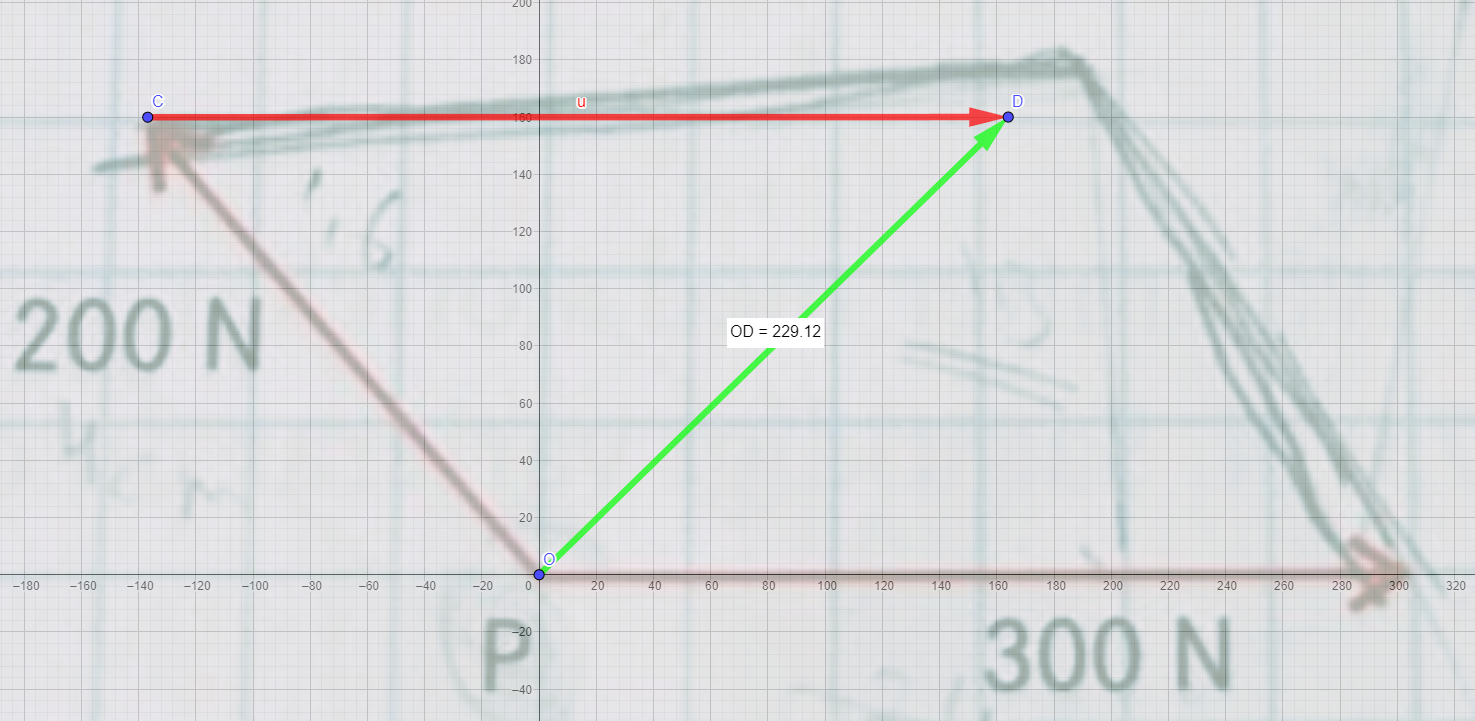 Sedan drar du resultanten från punkten P till spetsen av 300 N och då har du din resultant. Det är den gröna pilen i min bild.
