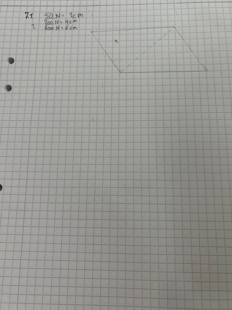 Jag behǒver hjâlp med denna uppgiften vet inte hur jag ska räkna resultanten jag Rita som du ser en parallelogram och den linjen som är inuti den 5,3 Cm . I facit står det att det e 0,22 kN vilket jag inte förstår för att jag har det att 50N=1cm dvs. Att 5,3*50=265 N=0,265 kN