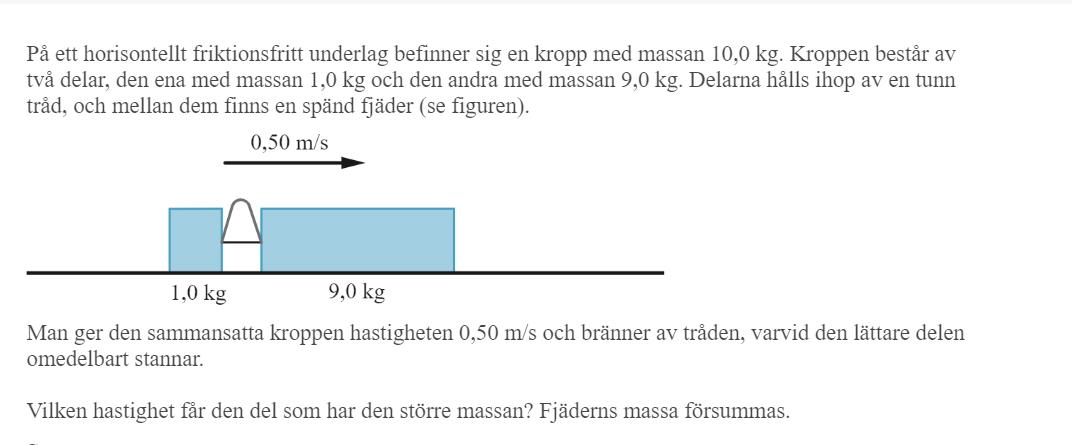 JohanF skrev:Hur skulle du ha löst uppgiften om den sammansatta kroppen hade stått still när tråden brändes av, och delarna hade åkt iväg åt varsitt håll?