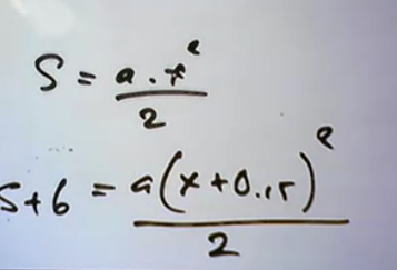 Vid tidpunkt t+0,15 har farkosten avverkat sträcka s+6 alltså s+6=0,5*a*(t+0,15)*(t+0,15) (ekvation2)