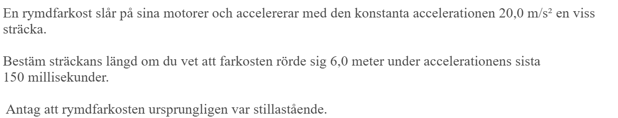 Vid tidpunkt t precis då de sista 150 ms börjar har farkosten avverkat sträcka s=0,5*a*t*t (ekvation 1)