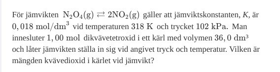 Problemet är att jag antar att det går åt 2x mol N2O4 när det bildas 2x mol 2NO2. I facit står det dock att det bildats 2x mol 2NO2, men att N2O4 endast minskat med x mol: