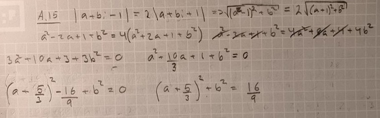 Det som lurar mig är att cirkelns ekvation brukar ges på formen (x-a)^2+(y-b)^2 = r^2, dvs a och b är konstanter. Men här är a och b variablerna. Ifall vi kallat z för x+iy kanske jag hade sett att problemet i princip var färdigräknat.