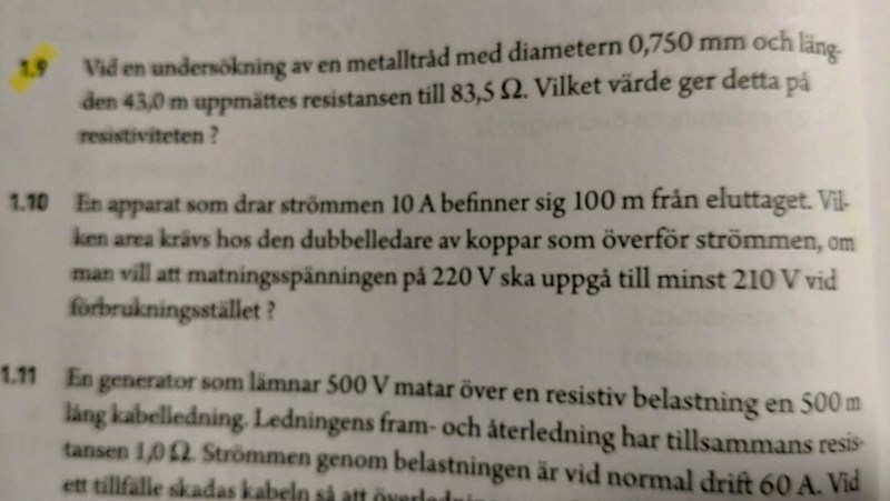 Jag beräknar då först resistansen för Rtotal för de två ledarna, genom R=U/I, alltså 210/10 vilket gör att jag får 21 Ohm, jag delar 21 Ohm med 2 så jag får 10,5 Ohm, alltså får ledaren ha max 10,5 Ohm som resistans?