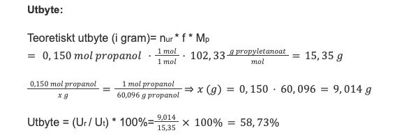 Det är frågan som jag har svarat på. Utbyte (i g och %) och teoretiskt utbyte (i g). Utbytet skall anges relativt det beräknade teoretiska utbytet som tar hänsyn till jämviktskonstanten