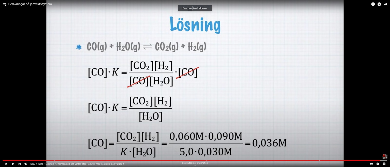 Hur skulle det gå till, menar du? Hur skulle du kunna få fram några molförhållanden när vi inte vet hur mycket kolmonoxid det finns vid jämvikt? Om du tittar på reaktionsformeln så ser du att 1 mol CO och 1 mol vatten ger 1 mol vätgas och 1 mol koldioxid, men man kan t ex pumpa in jättemycket koldioxid så att jämvikten förskjuts långt åt höger och nästan all kolmonoxid har förbrukats.