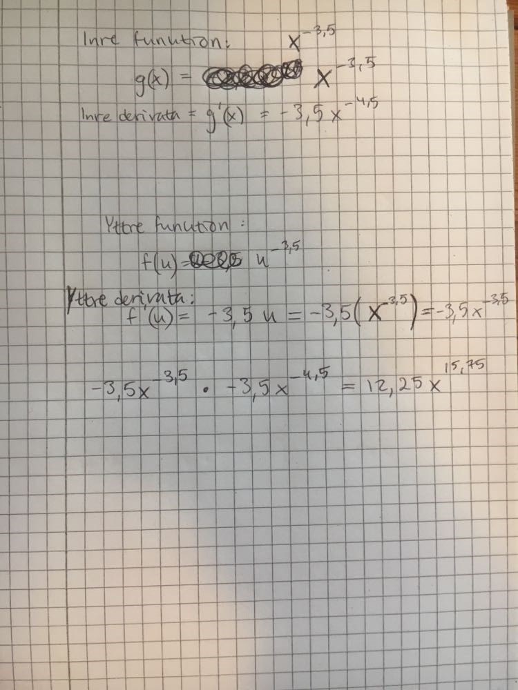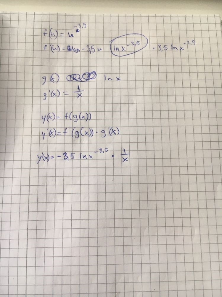 Varför man inte använda t,ex g(x) =ln(x⁻³,⁵) och få derivata g'(x) = 1/x⁻³,⁵ . -3,5x⁻⁴,⁵