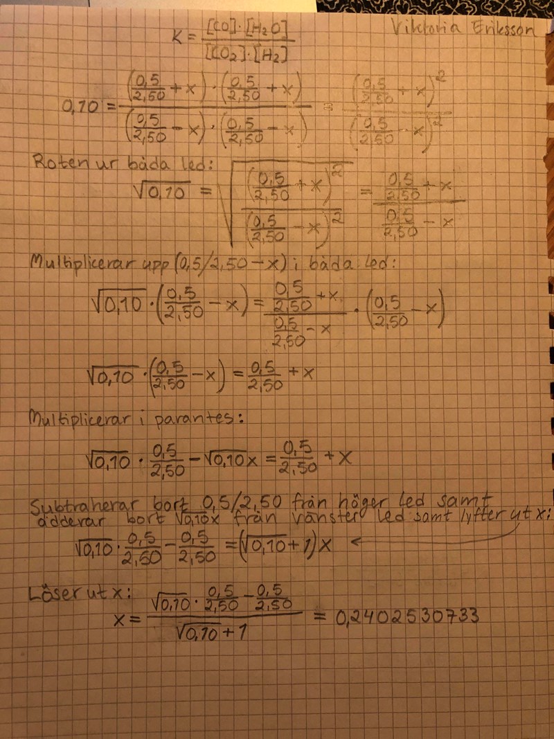 Hej! Jag har totalt fastnat och vet inte hur jag tänker eller hur jag ska gå vidare haha... Mitt svar är fel eftersom K inte blir 0,10 om jag sätter in mitt svar för x i jämviktsekvationen: CO*H2O/CO2*H2