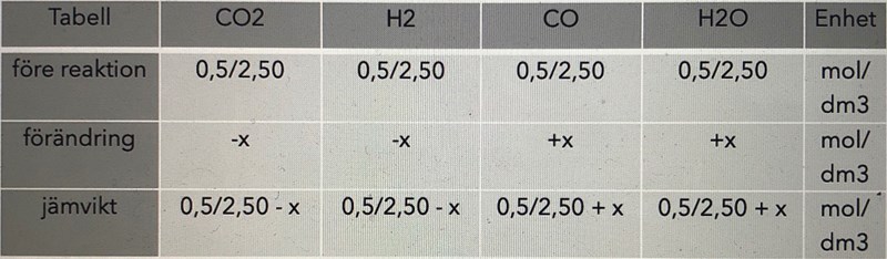 För jämvikten CO(g) + H2O (g) ⇄ CO2(g) + H2(g) är jämviktskonstanten 0,10 vid 2000 K. Man blandar 0,5 mol av vardera CO, CO2, H2O och H2 i ett reaktionskärl med volymen 2,50 dm3. Blandningen upphettas till 2000 K. Hur stor substansmängd kommer att finnas av de olika ämnena när jämvikt ställt in sig?