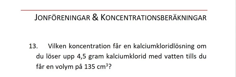 Tog reda på substansmängden, genom att ta reda på masstalet, och jag visste massan. Sen vet jag att substansmängden är samma så jag kunde då ta reda på koncentrationen pga att jag vet volymen.