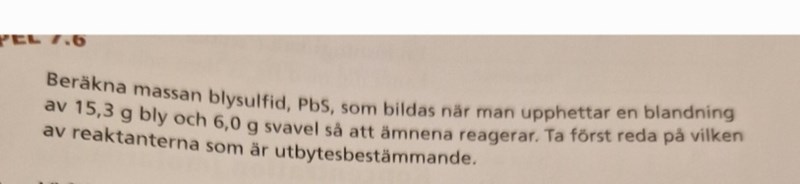En snabb rimlighetskoll är också bra: 15,3 gram bly blir 18 gram blysulfid, alltså hela massan bly plus några gram svavel. Svaret måste ligga i intervallet 15,3 <= m <= 15,3+6.