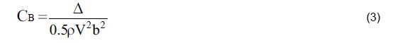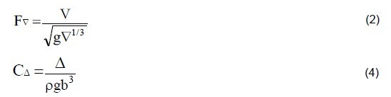 Ekvation 5 ger Cv utifrån hastighet(V), gravitationsacceleration(g), deplacement(inverterad triangel), vikt(triangel), vattnets densitet(ρ) och planande ytans bredd(b)