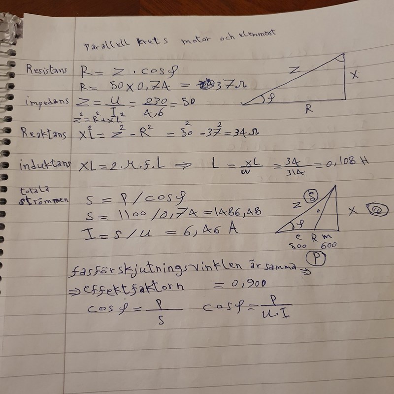 "En enfas motor har följande märkdata: 230V 4,6A cos FI = 0.74 0.6kW