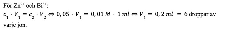 Vi bereder först en lösning med både Zn och Bi, sen ska man kunna separera metalljonerna och i detta fall görs det genom att utnyttja att Zn bildar aminkomplex medan Bi inte gör det, efter tillsats av ammoniak