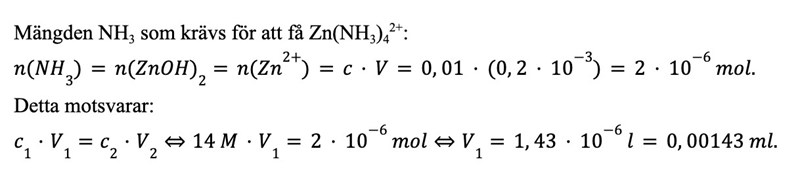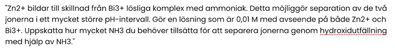 Smaragdalena skrev:Du vill ta reda på hur mycket ammoniak man skall tillsätta för att zinken skall bilda amminkomplex (inte fast zinkhydroxid) samtidigt som vismut skall bilda fast vismuthydroxid.