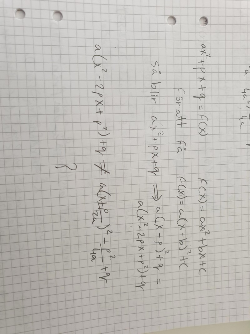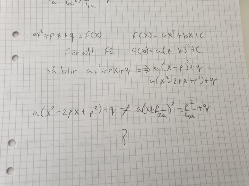 När jag ville skriva om det första det vill säga f(x) = ax2+px+q till det tredje dvs f(x) = a(x-b)2+c så fick jag att det blir a(x-p)^2+c vilket ger a(x^2-2px+p^2)+c. Jag fick inte fram a(x+p^2/2a)^2-((p^2)/4a)+q